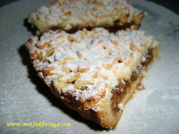 3 orta boy elmayı soyup içini temizleyin. Rendeleyip bir tavaya alın. 3 yemek kaşığı şeker ile beraber suyunu çekene kadar pişirin. 1 tatlı kaşığı tarçın ve yarım su bardağı cevizi ilave edip biraz soğumasını bekleyin. Soğuyan elmayı hamurun üzerine yayın. Buzdolabına kaldırdığınız hamuru çıkarıp turtanın üzerine rendeleyin. Dolapta en az yarım saat bekletin ki kolay rendelensin. 180C önceden ısıtımış fırında yaklaşık 20 dk kadar pişirin.
