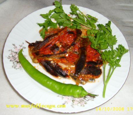 Hamsiler kılçıklarından ayıklanır.Bol suda iki_üç kez yıkanır.Soğanlar kalın bir şekilde halka halka doğranır.Patateslerde aynı şekilde kalın ve yuvarlak dilinir.Yuvarlak bir tepsinin dibine patatesler dizilir.Soğanlar biraz tuzla ovulup yarısı patateslerin üstüne serpilir.Balıklar tek tek açılıp, düzgün olarak tepsiye sıralanır.Birinci kat bittikten sonra balıkların üzerine kalan soğanlar serpilir.4_5 diş sarımsak ve bir avuç pirinç soğanların üzerine yayılır.Kalan hamsilerle ikinci kat döşenir.son olarak sosu hazırlanır.2 su bardağı su, 1 çay bardağından az sıvı yağ, 2 yemek kaşığı salça ve tuz iyice karıştırılıp balkların üzerine gezdirilir.Ocakta kaynatılıp 200 derecedeki fırında 35_40 dk pişirin.Afiyet şeker olsun…