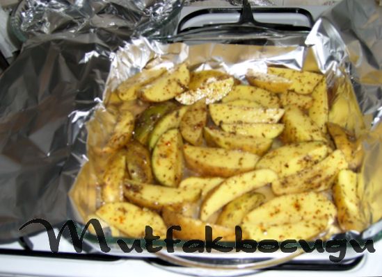- Alüminyum folyoyu borcamın içine serin ama koparmayın. Patatesleri folyonun üstüne sıralayın. Folyoyla patateslerin üstünü kapatıp folyoyu koparın. 220C önceden ısıtılmış fırında 1 saat pişirin. 1 saat sonra folyoyu kaldırın ve pişip pişmediğini kontrol edin. Eğer pişmediyse veya istediğiniz kıvama gelmediyse tekrar pişirin.