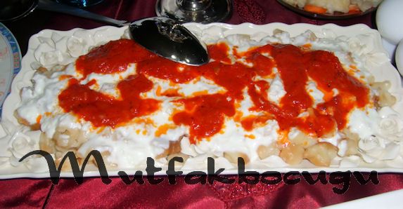- Salçalı sosuda yapıp sarımsaklı yoğurdun üzerine kaşıkla azar azar gezdirin. Afiyet olsun.