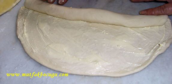 Açtığınız hamurları rulo yapın.Resimde gördüğünüz gibi sarın.Sardığınız hamurları yaniden tabak büyüklüğünde açın.Yağın donmasını bekleyin ki yağlar, açtığınızda taşmasın.