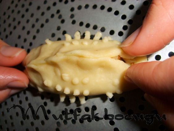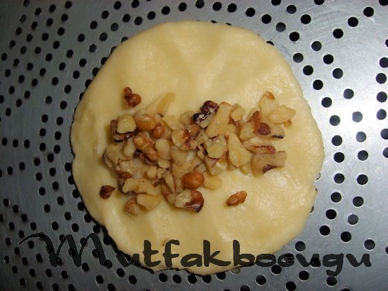 - Cevizden biraz daha büyük hamuru kalbura bastırarak açın. Resimdeki gibi.
